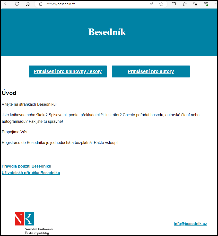 Národní knihovna ČR nabízí knihovnám aplikaci “Besedník” https://besednik.cz/ , která pomůže zprostředkovat kontakty na autory literárních děl a usnadňuje vzájemnou komunikaci při přípravě besed, autorských čtení, autogramiád a dalších aktivit. Vznik Besedníku iniciovala spisovatelka Ivona Březinová.