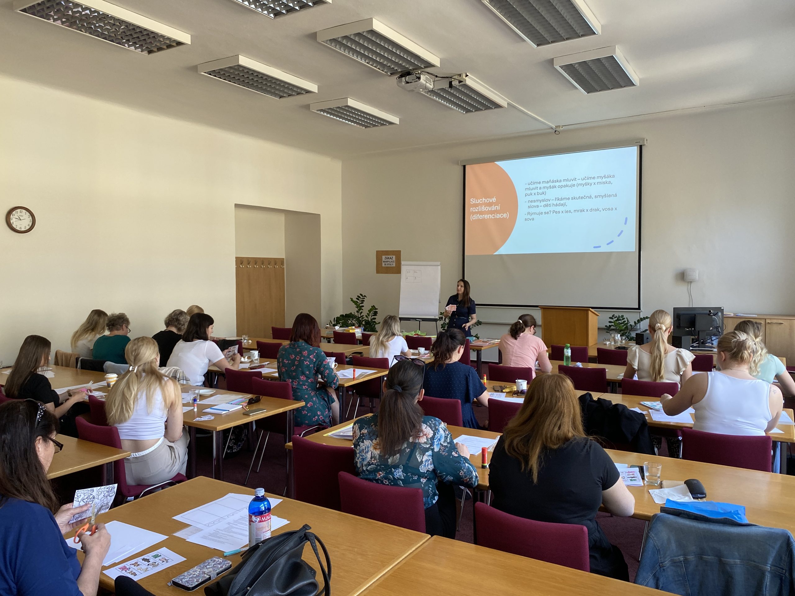 Druhé setkání se zaměřilo na sluchové vnímání a fonematické uvědomování, což jsou klíčové dovednosti pro jazykový vývoj, čtení a psaní. Účastnice se seznámily s metodami, jak děti vést k lepšímu vnímání zvuků a jak rozvíjet jejich schopnost rozlišovat jednotlivé hlásky. A opět to nebylo to jen o teorii! Byly tu i praktické hry a cvičení, které si učitelky mateřských škol mohly rovnou vyzkoušet a které jim ukázaly, jak mohou tyto dovednosti hravě podporovat ve třídě.