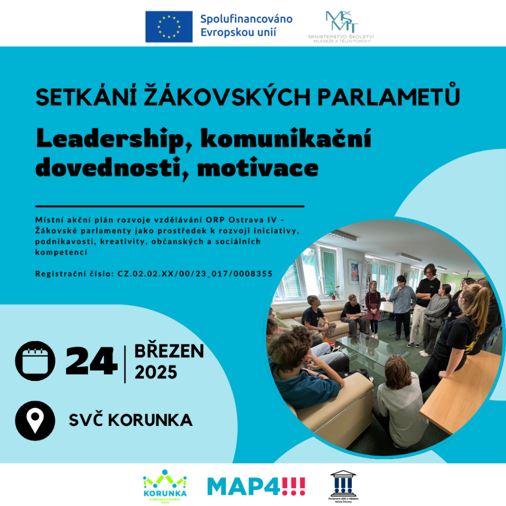 Srdečně vás zveme na Setkání žákovských parlamentů, které se uskuteční 24. března 2025 v SVČ KORUNKA. Obsahem setkání budou workshopy zaměřené na leadership a komunikační dovednosti. Během tohoto setkání se zaměříme na klíčové dovednosti, které vám pomohou stát se efektivními lídry a komunikovat s ostatními členy parlamentu i širší školní komunitou.