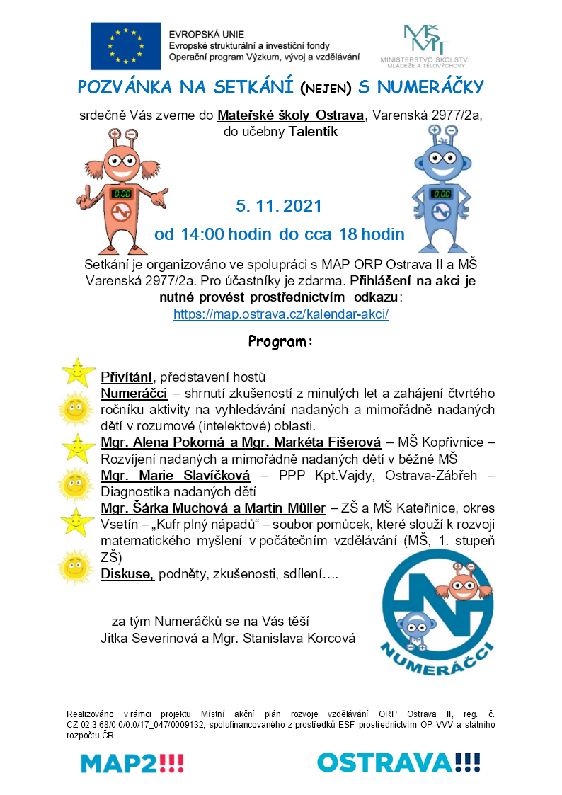 MAP ORP Ostrava II ve spolupráci s paní ředitelkou Mgr. Stanislavou Korcovou z MŠ Varenská 2977/2a pořádá Setkání (nejen) s Numeráčky.