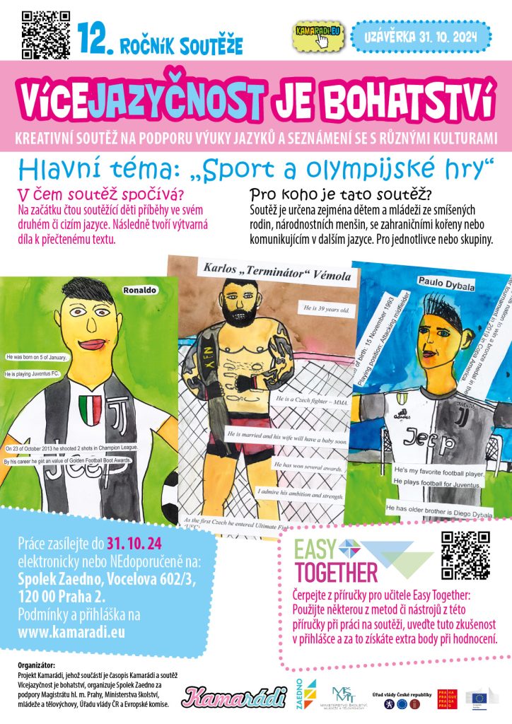 Spolek Zaedno vyhlašuje XII. ročník dětské kreativní soutěže na podporu čtení a psaní ve druhém jazyce s názvem Vícejazyčnost je bohatství. Hlavním tématem je „Sport a olympijské hry“.